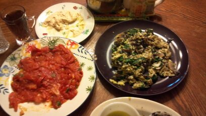 Breakfast of eggs with portabello mushrooms and spinach; tomatoes sauteed with garlic and serrano pepper, hummus, olive oil & zataar, and tea.